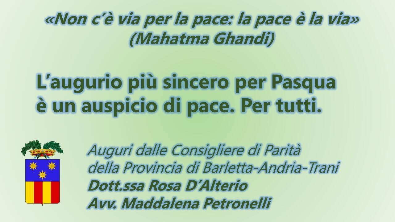 Descrizione Le Consigliere di Parità effettiva e supplente della Provincia di Barletta Andria Trani, dott.ssa Rosa D'Alterio e avv. Maddalena Petronelli, augurano Buona Pasqua