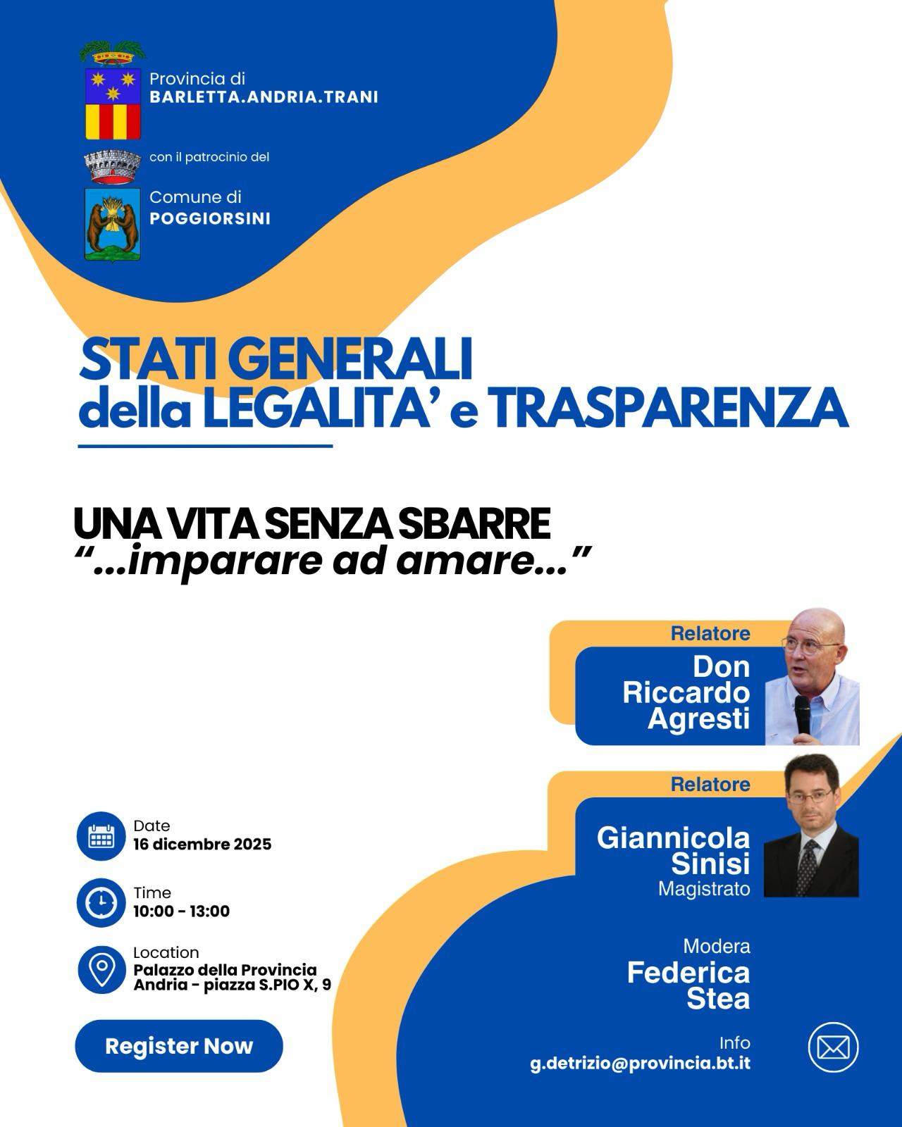 La Provincia di Barletta-Andria-Trani dà avvio agli Stati generali della legalità e trasparenza: il 16 dicembre si terrà il primo evento dal titolo “Una vita senza sbarre… imparare ad amare”. Parteciperanno il magistrato e autore del libro “Una vita senza sbarre”, Giannicola Sinisi, e don Riccardo Agresti, sacerdote nella parrocchia San Luigi a Castel del Monte e responsabile del progetto diocesano "Senza sbarre”. L’appuntamento è alle 9.30 nel Palazzo della Provincia (piazza San Pio X, Andria).